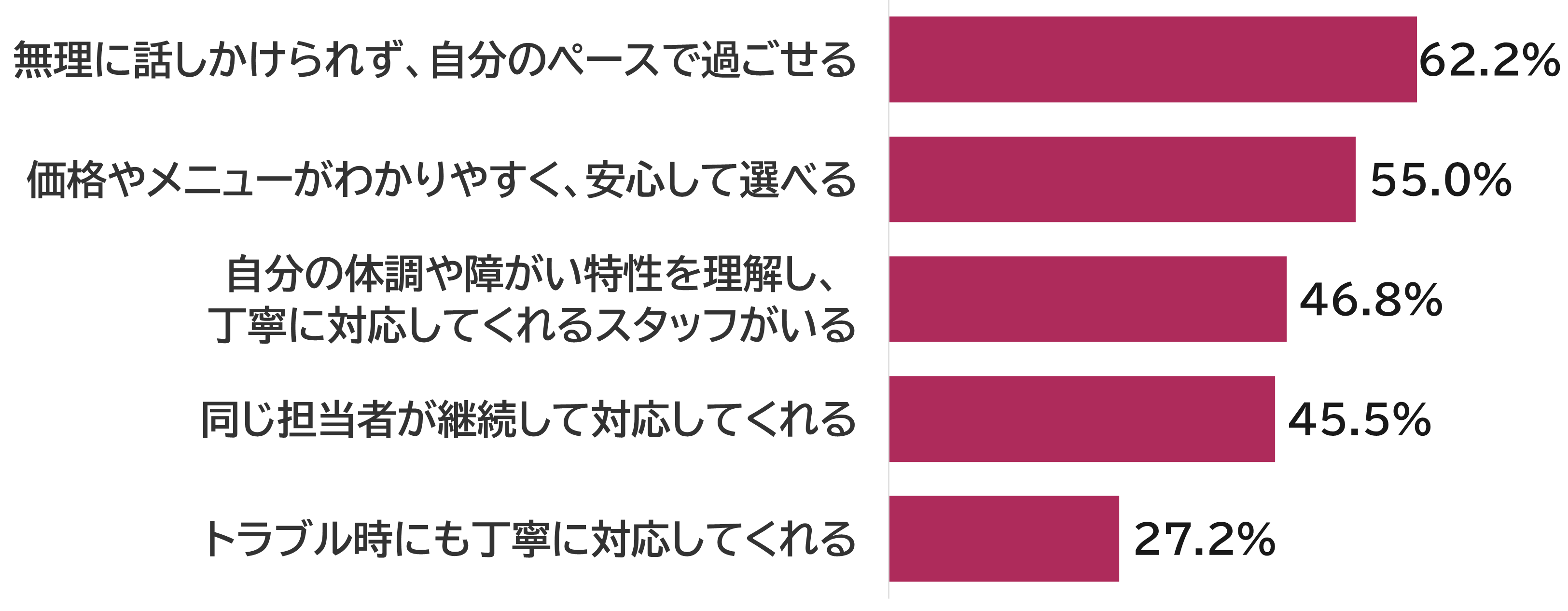 また「自分の体調や障がい特性を理解し、丁寧に対応してくれるスタッフがいる」は46.8%に上ります。専門的な知識がなくても構いません。「もし何かあったら、すぐに教えてくださいね」と伝えたり、お客さまの言葉にゆっくり耳を傾けたりと、「分かろう」と寄り添う姿勢そのものが、お客さまにとって何よりの安心材料になるでしょう。