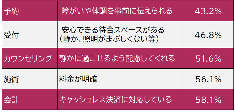 障がいのあるお客さまが「ここなら安心して通える」「また来たい」と感じるサロンには、どんな共通点があるのでしょうか。2つのデータから見えてきたポイントをご紹介します。