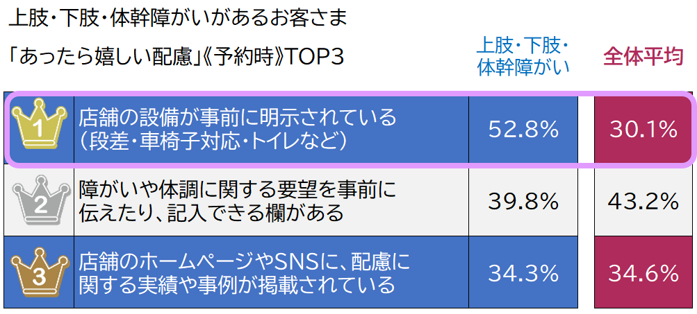 予約時で最も特徴的なのは、「店舗の設備が事前に明示されている」ことへのニーズの高さ。全体平均を22ポイント以上も上回る52.8%という数字からは、「お店に入れるだろうか」という来店前の不安を解消したい、という想いが伝わります。