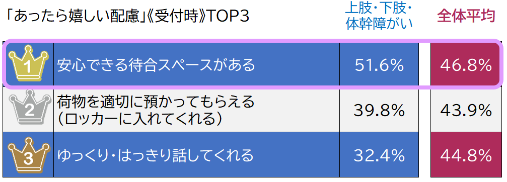 受付では「安心できる待合スペース」のニーズが51.6%と、全体平均より高くなっています。車椅子などでの移動を考えると、物理的な空間のゆとりが、お客さまの心のゆとりにも直結するようです。