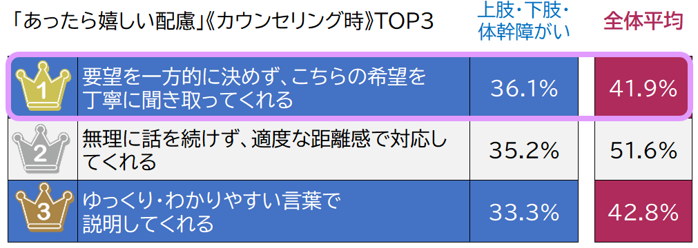 カウンセリング時のニーズは全体的に平均より低いものの、その中で最も高いのは「希望を丁寧に聞き取ってくれる」(36.1%)です。障がいを理由に「できない」と決めつけず、対等な立場で一緒にスタイルを探していく姿勢が求められています。