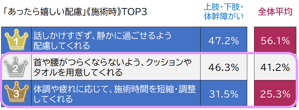 施術中は、身体的な負担を軽くする配慮へのニーズが特に高まります。「クッションやタオルの用意」(46.3%)や「施術時間の調整」(31.5%)は全体平均を5ポイント以上も上回り、身体的な負担を軽くする具体的なサポートが安心感につながることがわかります。