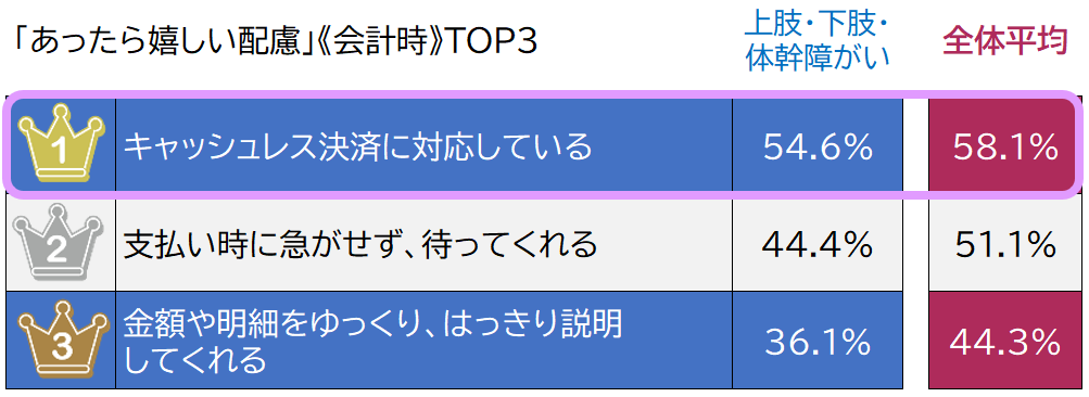 会計時のニーズも全体平均より低い傾向ですが、トップは「キャッシュレス決済に対応している」(54.6%)でした。財布から現金などを取り出す動作に困難がある方にとって、スマートフォンなどでスムーズに支払える決済方法は嬉しい配慮の一つです。
