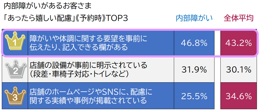 1位は「障がいや体調に関する要望を事前に伝えたり、記入できる欄がある」。事前に体調面の不安(例:「長時間同じ姿勢でいるのが難しい」など)を伝えられることで、お客さまは安心して来店できます。予約フォームに自由記述欄を設けるなどの工夫が喜ばれます。