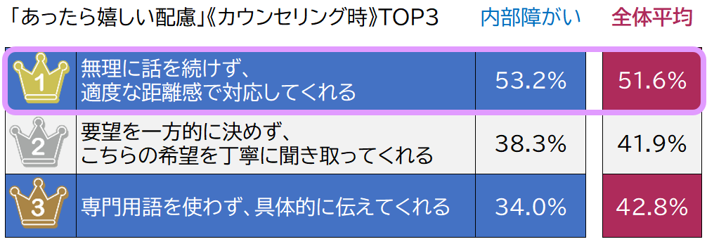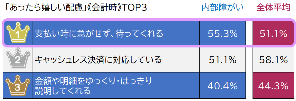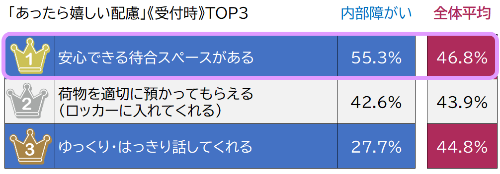 1位は「安心できる待合スペースがある」(55.3%)で、内部障がいのあるお客さまが特に重視していることが分かります。来店までの移動で、すでに体力を消耗している場合も。「どうぞ、おかけになってお待ちください」の一言と共に、すぐに座れる椅子へご案内するだけで、心遣いが伝わります。
