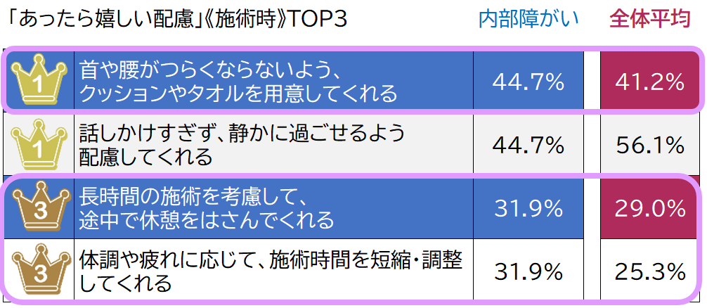 注目したいのは、施術中の配慮です。1位の「クッションの用意」や3位の「途中の休憩」など、身体的な負担を軽くする項目が、全体の平均より高い結果となりました。長時間同じ体勢でいることが、大きな負担になり得るのです。同率3位にも「長時間の施術を考慮して、途中で休憩をはさんでくれる」、「体調や疲れに応じて、施術時間を短縮・調整してくれる」がランクイン。