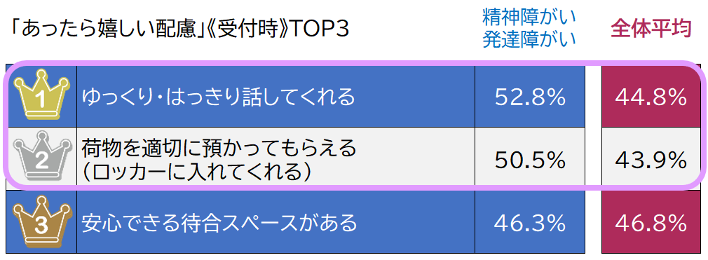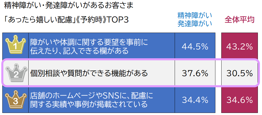 精神障がい・発達障がいのあるお客さまが、どのような配慮が「あったら、嬉しい」と感じているのでしょうか。#3でご紹介した調査をもとに、予約からお会計まで、5つのシーン別に見ていきましょう。障がいがある方全体の平均値と比較すると、その「気持ち」がより具体的に見えてきます。