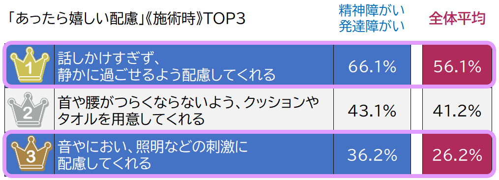 1位の「話しかけず、静かに過ごせるよう配慮してくれる」(66.1%)は全体平均(56.1%)を10ポイント上回る結果となりました。「静かに過ごしたい」というニーズは、精神・発達障がいのあるお客さまにとって特に重要です。 さらに見逃せないのが3位の「刺激への配慮」。こちらも全体平均(26.2%)を10ポイント上回っており、シャンプーの香りやドライヤーの音、照明の明るさなど、五感の敏感さに寄り添う姿勢が大切になります。