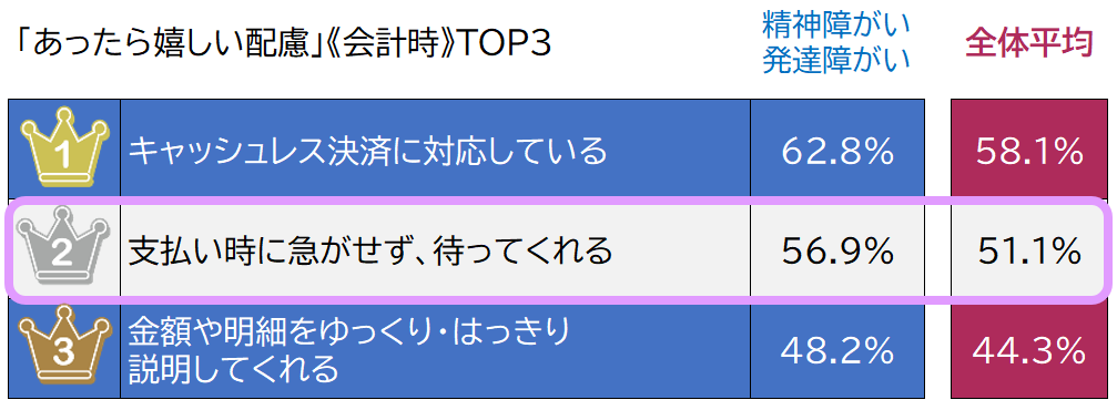 2位の「支払い時に急がせず、待ってくれる」(56.9%)は全体平均(51.1%)より5.8ポイント高く、ここでも「焦らなくて済む、落ち着いた環境」が求められていることがわかります。キャッシュレス決済の導入も、スムーズな支払いを助け、お客さまの負担を軽減します。
