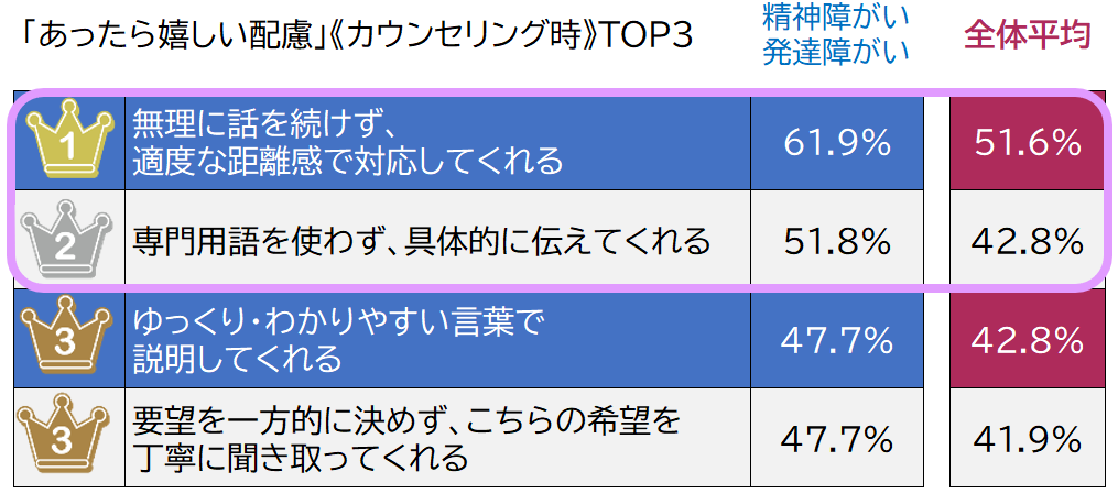 1位の「ゆっくり・はっきり話してくれる」(52.8%)は全体平均(44.8%)を8ポイント上回りました。一度に多くの情報を伝えると、混乱させてしまうことがあります。まずは落ち着いたトーンで、一つひとつ伝えることを意識してみましょう。
