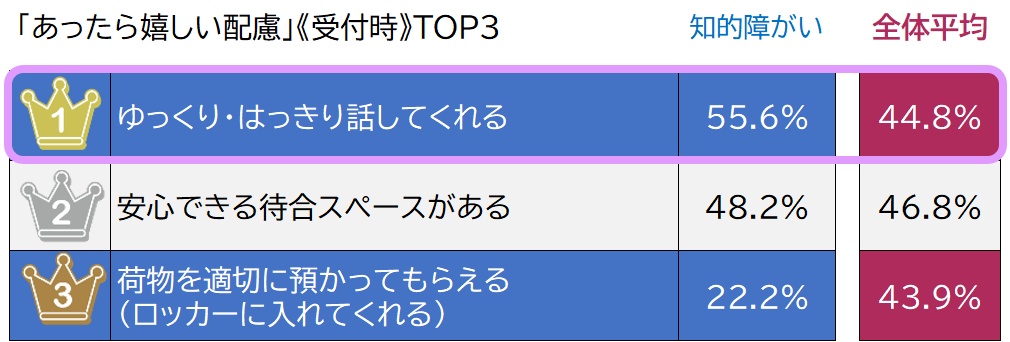 受付は、お客さまが最初にスタッフと接する大切な場面。ここで半数以上の方が「ゆっくり・はっきり話してくれる」(55.6%)を求めています。