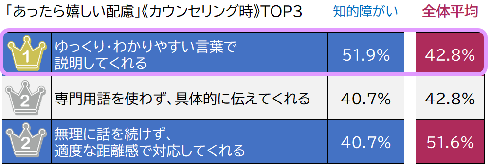 カウンセリングでも、「ゆっくり・わかりやすい言葉で説明してくれる」が1位で、「ゆっくり」「わかりやすく」がキーワードです。