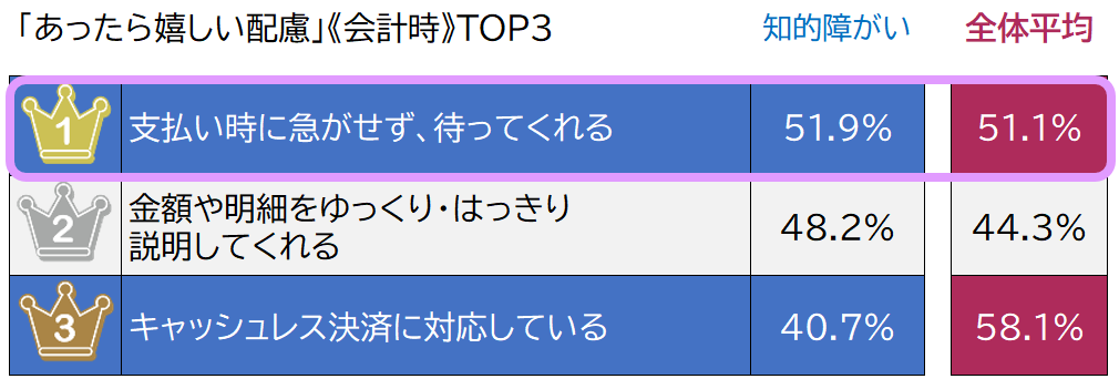お会計は、数字の確認やお金のやり取りなど、焦りやすい場面のひとつ。1位には「支払い時に急がせず、待ってくれる」(51.9%)がランクイン。ここでも「急かさない」が大切です。