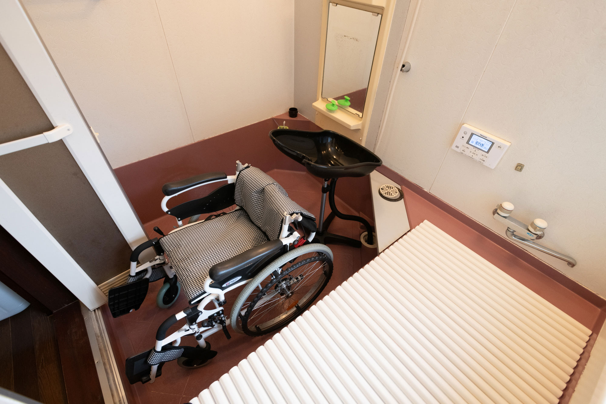 お客さまご自宅のお風呂場に移動式シャンプー台、車椅子をセット