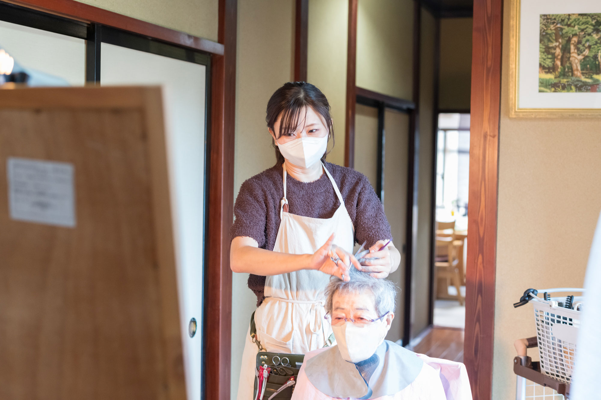美容師としてはブランクがあったので、まずは地元のヘアサロンに就職し、シャンプーからやり直しました。2年半かけてカットまで習得していきましたが、「介護の世界を何も知らない」という不安があったので、サロンの勤務を週4回に減らし、週1~2回デイサービス・訪問介護でも働き始めました。デイサービスでは約2年間、訪問介護では5~6年ほど、排泄や入浴・食事の介助など介護の仕事をひと通り経験しました。最初は「家族以外の高齢者の方に接してみたら、自分はどう感じるだろう」といった不安もありましたが、実際に働いてみたら「思っていたより楽しい!」と感じることができました。「高齢者」とひとくくりにするのではなく、お一人おひとりの人生や人柄を知ることが大切だったのだと感じています。また、訪問介護ではさまざまなご家庭に訪問する際に気を付けなければいけないことや、実際の在宅介護の様子について学ぶことができました。その後、地元の訪問美容の先輩のもとで見習いを1年ほど経験し、2020年に独立しました。