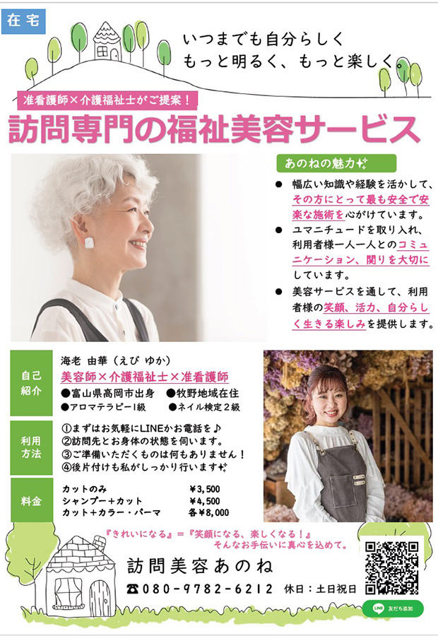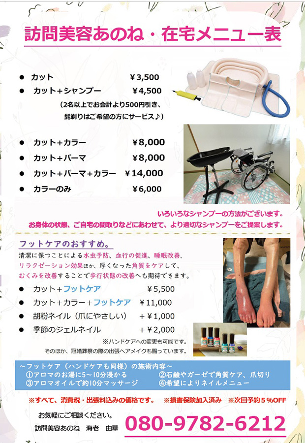 「訪問美容あのね」チラシ裏面。料金は近々改定し、値上げをしていく予定だそう