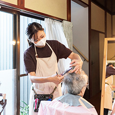 鏡越しにお客さまと目を合わせて、ニッコリ。介護をしているご家族のカットを依頼されることも