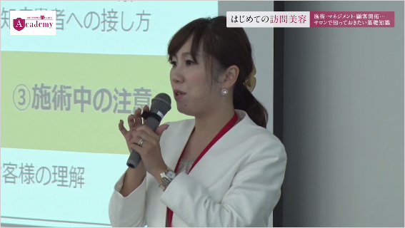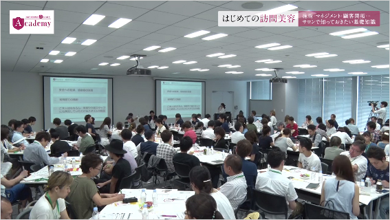 当日は、「訪問美容の一日」に密着した映像の放映・感想のグループディスカッション・実際にサロンへ導入する際の注意点説明など、コンテンツが盛りだくさん。「サロンスタッフに訪問美容を兼任してもらうのと、訪問美容専任スタッフを雇用するのと、経営的にはどちらが効率的でしょうか?」のような、一歩踏み込んだ質問も飛び出す、充実したひと時となりました。動画では質疑応答のコーナーも含めてイベントの様子をまるごとご覧いただけます。